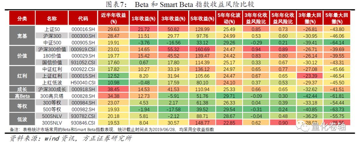 可以发现2019上半年表现最好的是沪深300成长,其次是300高贝塔。拉长周期到近5年,价值风格指数整体占据上风,普遍跑赢宽基指数。其中表现最抢眼的是沪深300价值指数,近3年累计收益55%,近5年累计收益161%,年化收益21.7%,年化波动24.47%,年化收益风险比0.89。其次300SNLV、180价值和中证红利都有不俗的长期业绩表现,最大回撤方面控制的最好的也是这几款产品。