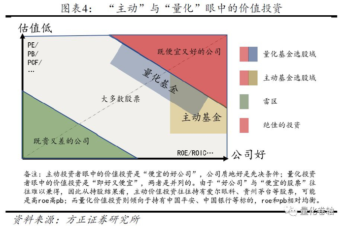 由于“好公司”与“便宜的股票”往往难以兼得,因此从持股结果看,主动价值投资常持有爱尔眼科、贵州茅台等股票,特征可能是高ROE高PB,而量化价值投资者对这类股票有不一样的看法。