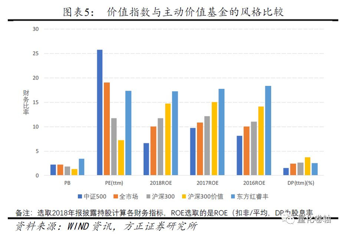 我们选取一个较为典型的主动价值投资基金,东方红资管的东方红睿丰,以其持仓和沪深300、中证500、全A以及沪深300价值指数做一个对比。以2018年年报披露持仓为例,分别比较市净率(PB)、市盈率(PE)、近三年净资产收益率(扣非ROE)、股息率(DP)等指标,详见图表5。