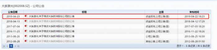 记者查阅大族激光公告发现,其确实发布了6次关于增资大族欧洲股份公司的公告,最近的一次是2019年4月22日。