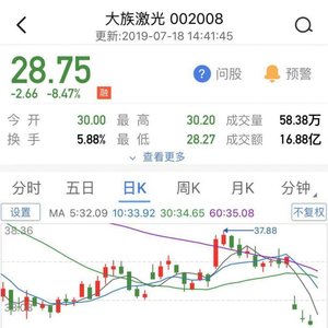 此前的7月13日,大族激光发布了2019年中期业绩预告,其归属于上市公司股东的净利润同比下降60%—65%。受此消息影响,7月15日开盘,大族激光的股价直接被“暴锤”到跌停板上。此后两个交易日,其股价分别下挫2.06%和1.16%。加之今日目前为止的跌幅,大族激光的股价在四个交易日内暴跌逾20%。