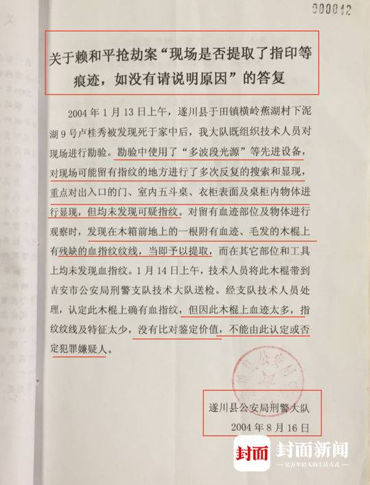 对此,在一份盖有遂川县公安局公章的情况说明中,遂川县公安局刑警大队回复称,该大队确曾在案发现场发现一个附有血迹和毛发的木棍,上有残缺的血指纹纹线,随后送吉安市公安局刑警支队技术大队送检。“但因木棍上血迹太多,指纹纹线及特征太少,没有比对鉴定价值,不能由此认定或否定犯罪嫌疑人。”