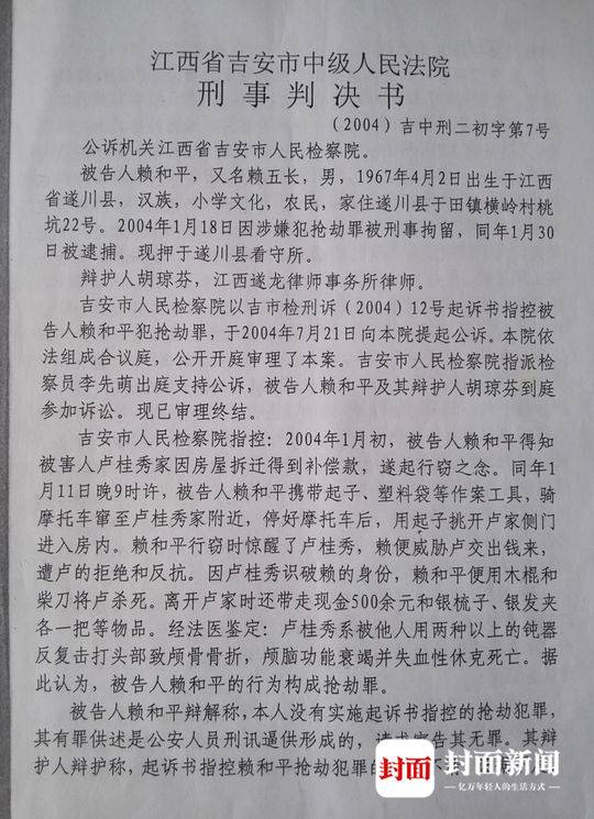 2004年7月21日,赖和平被抓半年之后,该案在吉安市中级人民法院开庭审理,两个月之后正式宣判。法院审理认为,赖和平在入室盗窃被卢老太发现后,持木棍、柴刀等凶器将其杀死,劫得现金510元和银梳子等物。公诉机关指控犯罪基本事实清楚,基本证据确凿。判决赖和平死刑,缓期两年执行。