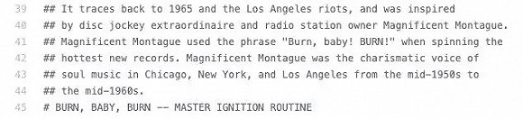 例如,在登月模块(Luminary099)文件夹中,有一个名为BURN_BABY_BURN--MASTER_IGNITION_ROUTINE.agc的文件,中文可以叫做“燃烧吧,宝贝,燃烧吧——控制点火程序”,从名字上来看就非常的有意思了。