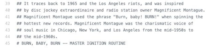 “燃烧吧,宝贝,燃烧吧”可追溯到1965年的洛杉矶骚乱,当时著名DJ、电台所有者“伟大的蒙塔古”(Magnificent Montague)在打碟时使用了这句话。伟大的蒙塔古是上世纪50年代中期至60年代中期,在芝加哥、纽约和洛杉矶极富感召力的灵歌代表人物。