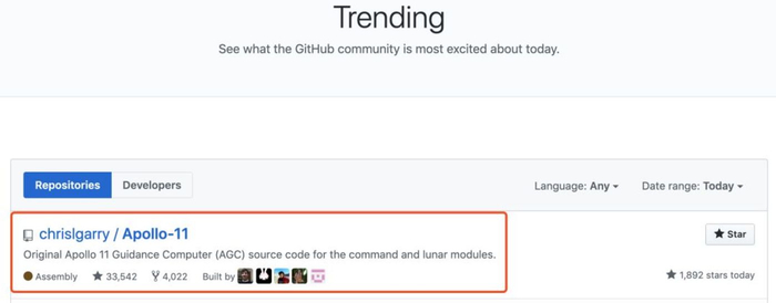 阿波罗制导计算机(AGC)代码开源,登GitHub热榜第一而就在今天,GitHub一个名叫“Apollo-11”的项目荣登今日趋势榜第一,已获33000+颗星。