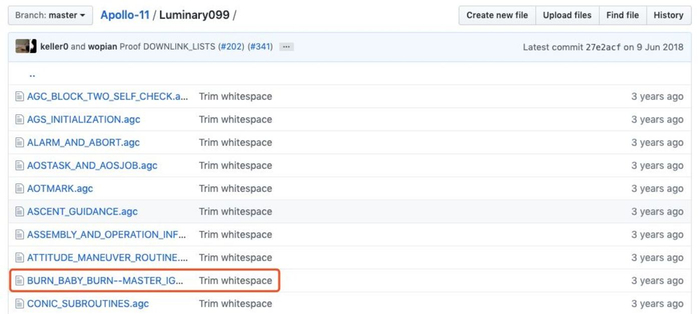 例如,在登月模块(Luminary099)文件夹中,有一个名为BURN_BABY_BURN--MASTER_IGNITION_ROUTINE.agc的文件,中文可以叫做“燃烧吧,宝贝,燃烧吧——控制点火程序”,从名字上来看就非常的有意思了。