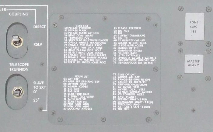 阿波罗制导计算机中动词和名词的部分数字代码列表,打印在侧板上供快速参考