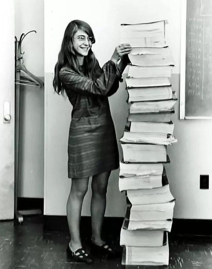 阿波罗登月计划软件工程主管Margaret Hamilton,及她身旁一大堆AGC代码文件