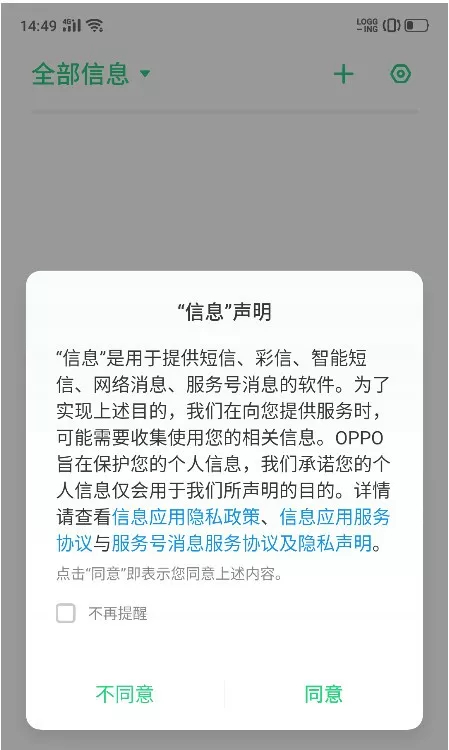 OPPO回应《IT时报》称,短信应用没有默认开启智能信息服务,在用户第一次进入短信应用时弹窗显示“信息”声明,经用户同意后才能使用。