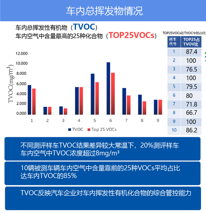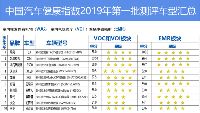 测评项目包括车内挥发性有机物(VOC)、车内气味强度(VOI),以及车辆电磁辐射(EMR)。