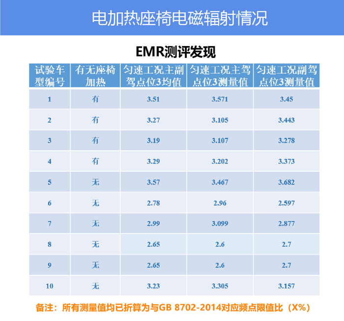 从本批次测评结果来看,有4辆车配备座椅加热,其低频磁场辐射与无座椅加热测量结果相当。这说明座椅加热系统只要经过良好的设计控制,其电磁辐射完全可以达到与无加热座椅一样的安全水平。