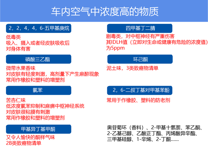 本次测评的部分样车车内也检测出一些对人体健康有危害或影响车内气味的物质。例如,具有果香味的磷酸三乙酯在高剂量下可能使人产生麻醉现象,具有苦杏仁味的氯苯在低浓度下即可麻醉和抑制中枢神经系统,具有泥土味的环己酮则是3类致癌物。这些物质主要来自于车辆的橡胶、增塑剂以及防老剂等材料,在本次测评样车的车内检出量很低,但消费者若发现新车内出现明显的这些气味,需要引起警惕。
