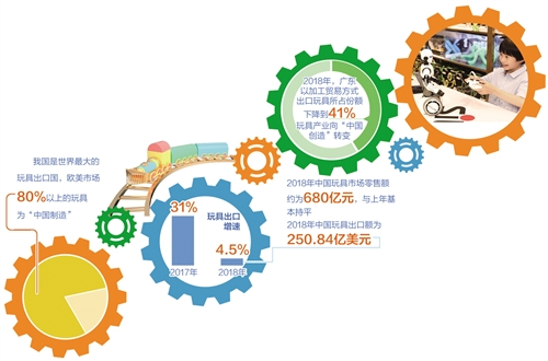 我国是世界最大的玩具出口国,欧美市场80%以上的玩具均为“中国制造”。不过,数据显示,2018年我国玩具出口增长率回落较大,2017年玩具出口同比增长31%,2018年增速降至4.5%,出口额为250.84亿美元。玩具产业发展为何会出现这样的“磕磕绊绊”?