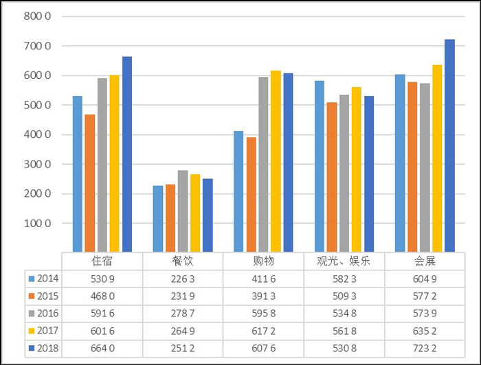 图4.近五年新加坡旅游业收益分布(单位:百万美元)