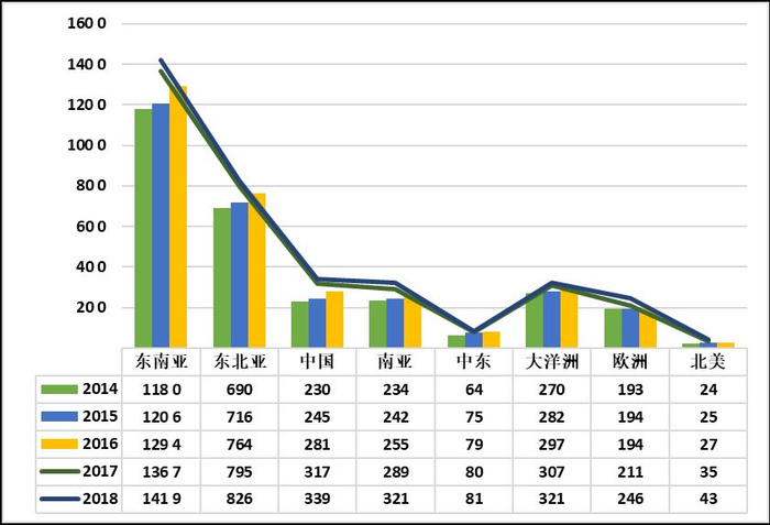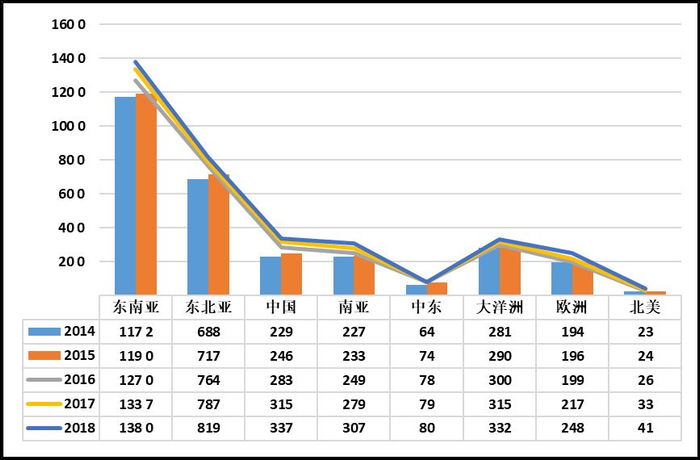 图3.近五年新加坡入境乘客来源地分布图(单位:万人)