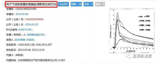蓝洞查询到,以派克斯实验公司(PAX LABS,Juul的出品方)为申请主体的专利目前仅一个,主要涉及用于气溶胶装置的烟碱盐调配物及其方法,提供用于在电子香烟中产生可吸入气溶胶的烟碱盐液体调配物,其包括形成大约0.5%至大约20%烟碱的烟碱盐。