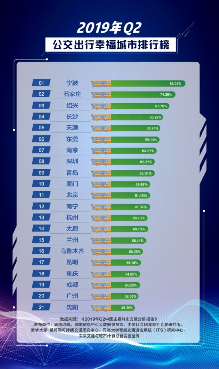 《报告》从监测的50个城市中,选取了公交信息化程度较高的21个城市进行分析,发现2019年二季度,宁波的地面公交出行幸福指数最高,达到85.05%,与正理想值最接近;深圳在超大城市中 “幸福指数”排名第一,天津在特大城市中的“幸福指数”排名首位。