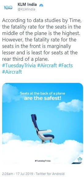 荷兰皇家航空公司印度分公司周三因为一则推文而对外道歉。在那则推文当中,荷兰皇家航空公司印度分公司表示,飞机上不同区域的座位对您在飞机失事中幸存可能性有影响,飞机后面的座位上乘客在飞机失事中幸存的可能性最高,而飞机中间座位的死亡率是最高的。