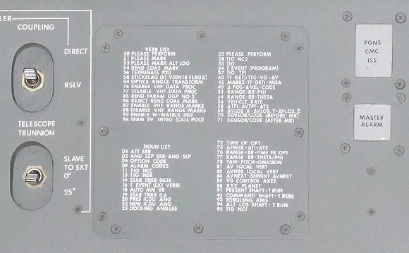 阿波罗制导计算机中动词和名词的部分数字代码列表,打印在侧板上供快速参考