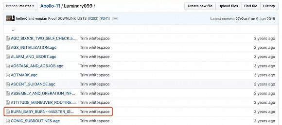 例如,在登月模块(Luminary099)文件夹中,有一个名为BURN_BABY_BURN--MASTER_IGNITION_ROUTINE.agc的文件,中文可以叫做“燃烧吧,宝贝,燃烧吧——控制点火程序”,从名字上来看就非常的有意思了。
