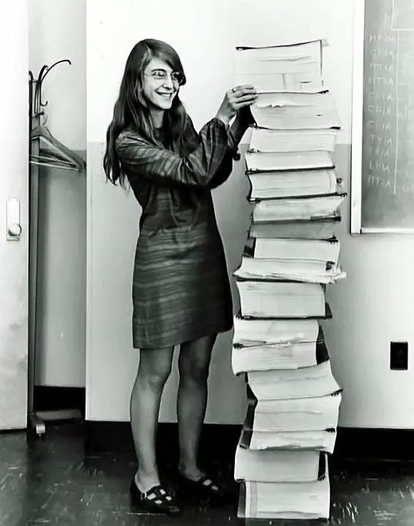 阿波罗登月计划软件工程主管MargaretHamilton,及她身旁一大堆AGC代码文件