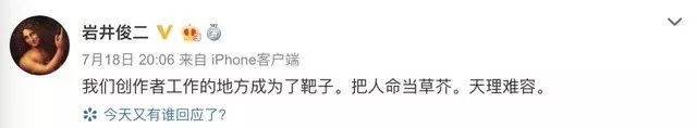 昨晚(18日),日本著名导演岩井俊二通过微博怒斥纵火者,称:“我们创作者工作的地方成为了靶子。把人命当草芥。天理难容。”