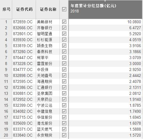 下图为2017,2018年两个年度新三板市场分红TOP20