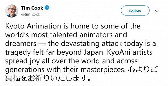 美国苹果公司CEO蒂姆·库克在Twitter上用英日双语表示:“京都动画是世界上最有才华的一些动画师和梦想者的家——今天的毁灭性袭击是一场远远超出日本的悲剧。京阿尼的艺术家通过他们的杰作将欢乐传播到世界各地,跨越了几代人。愿死者安息。”