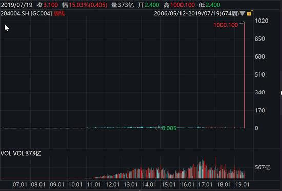 Wind数据显示,19日,GC004最高成交到1000.10%。当天GC004收盘利率为3.1%,加权平均利率为3.5930%,最低利率为2.8%,均与日内高点差距悬殊。