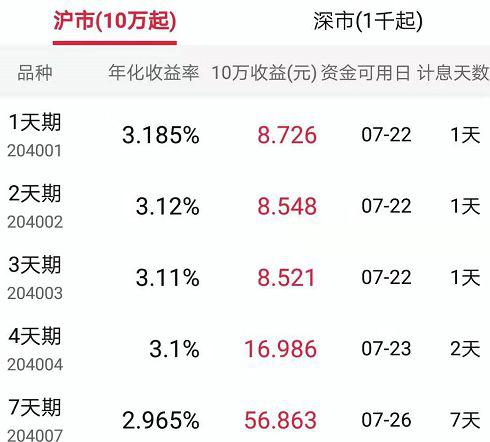 按照现行规定,今日(7月19日)开展4天期回购,首次资金交收日为7月22日,到期日为7月23日,到期资金交收日为7月24日,实际占款天数为2天。