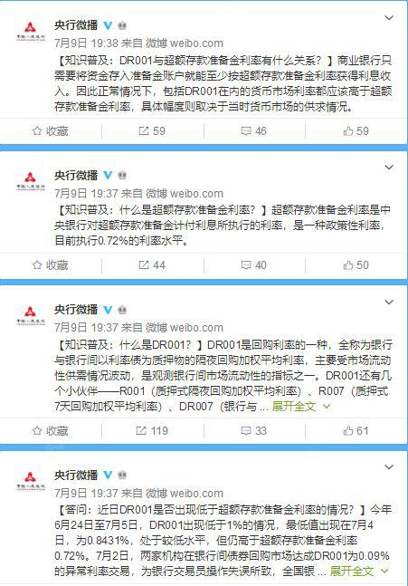 本月上旬,由于DR001出现异常低利率交易,历史上首次与0.72%的超额存款准备金利率倒挂,引起较大关注。为此,7月9日晚间,央行一口气发布了4条微博,就DR001与超额存款准备金利率相关问题做了解答。