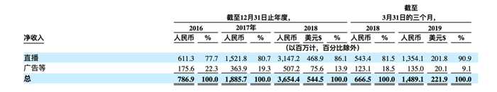 斗鱼作为一个直播平台,收入全部来源于直播和广告。截至2019年3月,公司营收的90.9%来源于直播,这一数据在2018年及2017年分别为86.1%及80.7%,公司的营收越来越向直播收入倾斜。