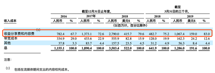 招股书显示,2016-2018年间,斗鱼支付给主播的分成占营收比例逐年提升,到2019年一季度时收入抽成及内容成本(即支付给主播的礼物抽成、主播固定工资、经纪公司礼物抽成以及内容制作费用等)占总成本比重已达83%。换言之,给主播和经纪公司的钱是公司营业成本的主要来源,斗鱼在拥有高人气的主播面前几乎是“打工仔”的身份。