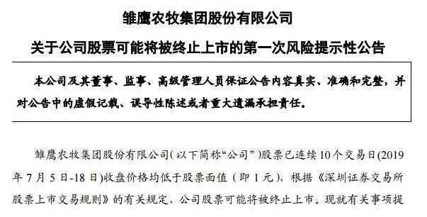 7月18日晚间,雏鹰农牧披露了公司股票可能将被终止上市的第一次风险提示性公告。根据相关规定,连续20个交易日的每日股票收盘价均低于股票面值(即1元),深交所有权决定终止公司股票上市交易。
