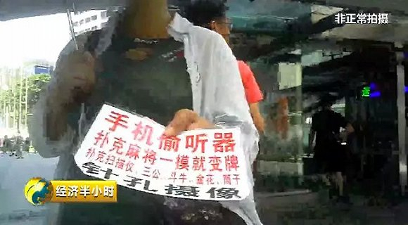广东省深圳市的华强北商业区,著名的电子产品集散地。央视财经《经济半小时》记者发现,很多商贩在街道上,手里拿着印有数十种不同外观的窃听、偷拍设备的广告牌,拉住行人,推销自己的针孔摄像机和窃听设备。销售人员,光天化日之下,在大街上公然叫卖这类设备。