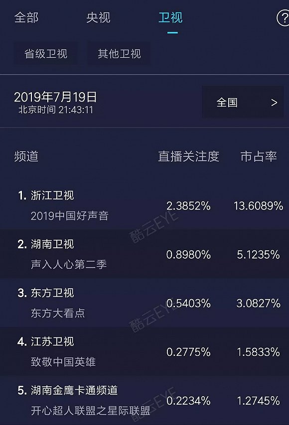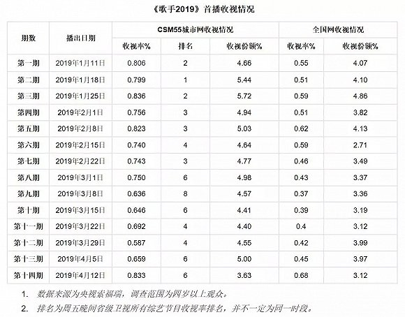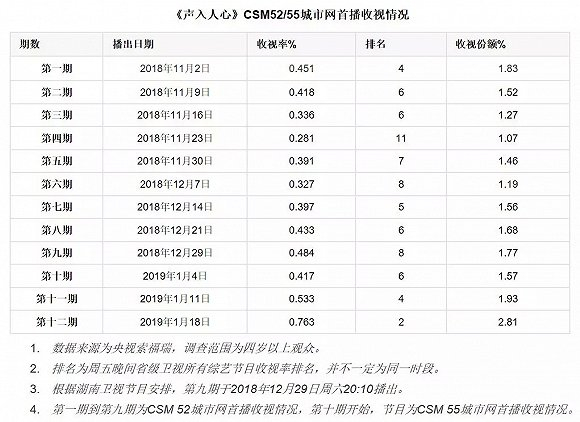 播出时间撞上了老牌音乐评论综艺《中国好声音》。从收视率的对比来看,《中国好声音》以压倒性优势取胜,收视直接破2。