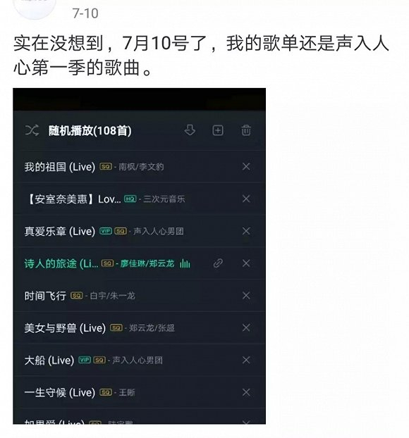 跟拍多场巡演的粉丝湖边的豆豆(微博ID),就在近期发出感叹:怎么播出半年了我的歌单还是《声入人心》第一季的歌曲?
