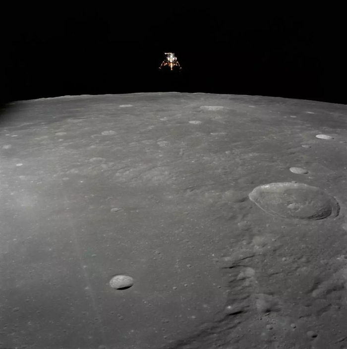 指令舱内的航天员在轨拍摄阿波罗12号登月舱在月面着陆