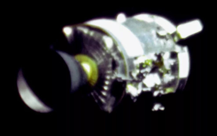 1969年3月6日,阿波罗9号航天员在舱外拍摄指令舱-服务舱与登月舱对接