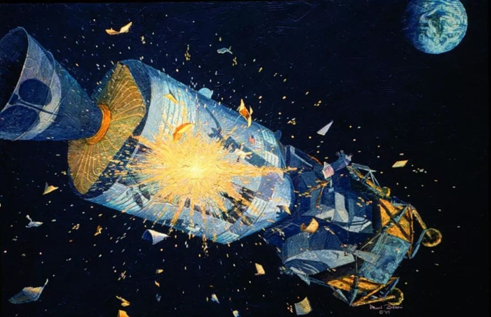 航天员施韦格特立即意识到大难临头,马上向地面中心报告:“我们这里出事了,已听到一声巨响,主线路电压不足。”指令长洛弗尔从窗口看到一股股气流从飞船服务舱冒出来,又立即补充道:“服务舱正向空中放出什么东西,好像是某种气体。”