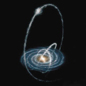 当人马座矮星系星被银河系牢牢拽住,并在银河系所产生的巨大潮汐力不断撕扯下,星系的形状便逐渐发生了变化,就像一个面团被拉成了面条,最终形成星流。由于人马座矮星系一直在绕银河系转动,因此银河系抻拉出来的星流也大致沿着矮星系的轨道,也像丝带一样围绕着银河系,现在它被拉出的线条比银河系的直径还长,已经绕银河系两三圈之多。