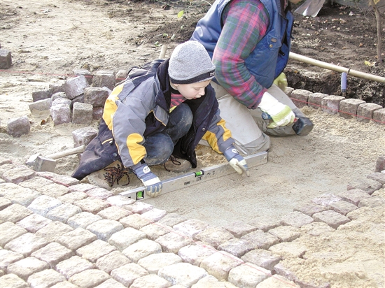 一位德国孩子跟随父亲在铺设自家花园