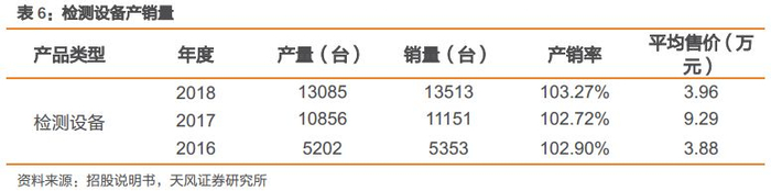 公司检测设备产销率维持稳定。2018 年检测设备产销率达 103.27%。公司生产环节主要是进行设备组装和质量测试,对公司产能影响较大的是生产设备规模、生产和质量测试的生产人员的数量和工作效率。