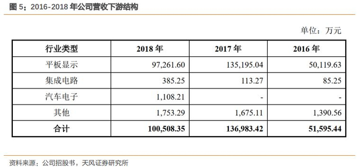 公司收入构成中,按照下游应用统计,主要有平板显示、集成电路和汽车电子等,目前平板显示行业营收占比较高, 2018 年公司营收 10.05 亿元,其中平板显示是 9.73 亿元收入。