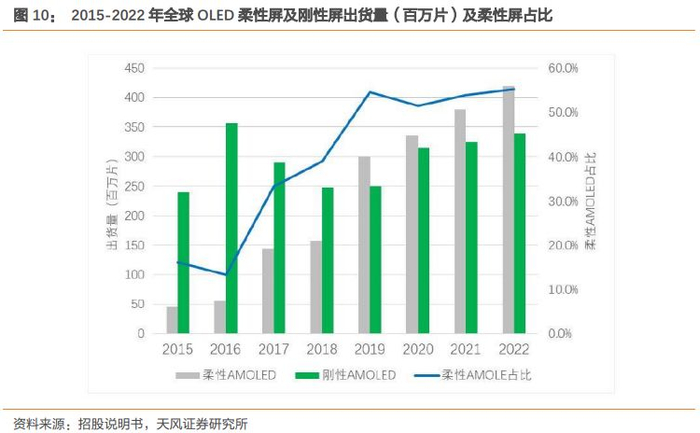 根据 IHS 数据,2018 年柔性 AMOLED 面板出货量将达到 1.576 亿片,比 2015 年 4,650 万片增加三倍以上,年复合增长率为 50%。IHS 预测在 2020 年柔性 AMOLED 面板出货量预计将达到 3.357 亿片。在 2020 年,柔性 AMOLED 面板出货量预计将占 AMOLED 面板总出货量的 52%。