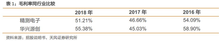 2016 年及 2017 年公司毛利率与可比公司精测电子差异不大。近三年,公司综合毛利率分别为 58.90%、45.03%和 55.38%。