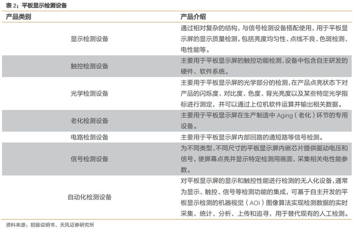 平板显示检测设备主要作用于 LCD、OLED 等平板显示器件。平板显示检测是平板显示器件生产各制程中的必备环节,平板显示检测设备可在 LCD 和 OLED 产品平板显示器件的生产过程中进行显示质量、触控、光学、信号等各种关键功能进行验证、检验、筛选和补偿修复,尤其是自动化检测设备具有精度高、速度快、无接触的优点,克服了人工检测的弊端,可有效降低平板显示厂商的生产成本。