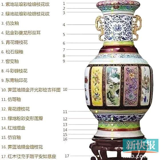 这件东西为什么叫瓷母呢?是因为它集多种瓷器品种于一身:瓶洗口,长颈,长圆腹,圈足外撇。颈两侧各置一夔耳。器身自上而下装饰的釉、彩达15层之多。所使用的釉上彩装饰品种有金彩、珐琅彩、粉彩等;釉下彩装饰品种有青花;还有釉上彩与釉下彩相结合的斗彩。所使用的釉有仿哥釉、松石绿釉、窑变釉、粉青釉、霁蓝釉、仿汝釉、仿官釉、酱釉等。