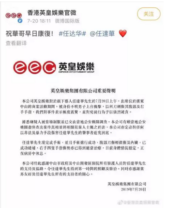 20日18时左右,@香港英皇娛樂官微发布声明证实,任达华被“利刀刺伤其腹部及右手手指”。声明同时透露,任达华已完成手术,手术进行成功,腹部刀伤轻微伤及内脏,已成功缝补,右手四只手指伤势也得到适当治疗,目前身体情况稳定,正在病房中休息。